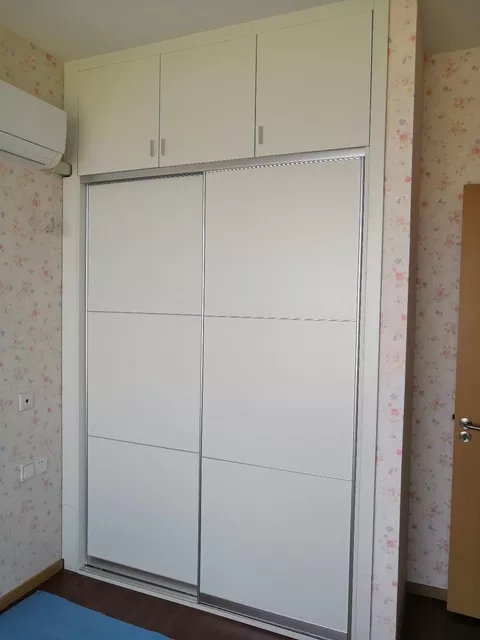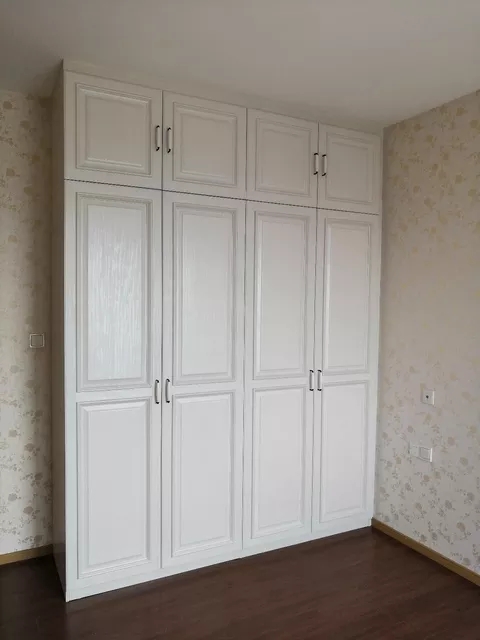 當(dāng)白布紋的雅白遇上銀色邊框的高貴,自然凝練出一種低調(diào)、清冷的貴族氣息。通頂嵌入式的衣柜,由上吊柜+移門柜組合而成。不常用之物置于頂上,平日所穿衣物掛于移門柜內(nèi),收納有序,生活則處處意趣!