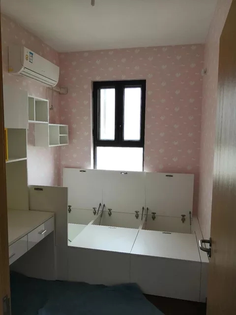 榻榻米,沒有選用常規(guī)的床柜一體設(shè)計(jì)法,而是在一端墻體,分出兩格敞開式吊柜,錯(cuò)落排開,化解了空間不足的逼仄感。
