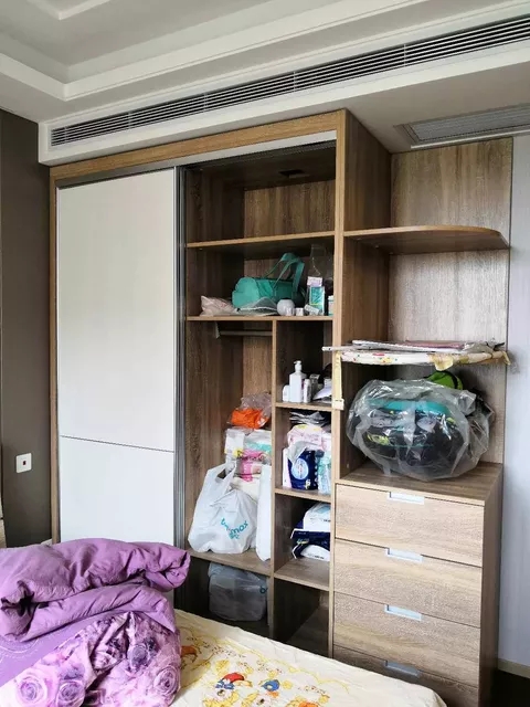 此次回訪剛好趕上客戶在搬家,所以場(chǎng)面略顯凌亂,不過也正好讓我們看到了宜科家具在生活中最真實(shí)的一面。次臥空間不大,大體量的產(chǎn)品顯然不適用,柜體不大,但結(jié)構(gòu)完整,由移門柜+左上轉(zhuǎn)角+左下床頭柜三部分組合而成,用實(shí)力見證超強(qiáng)的收納力。
