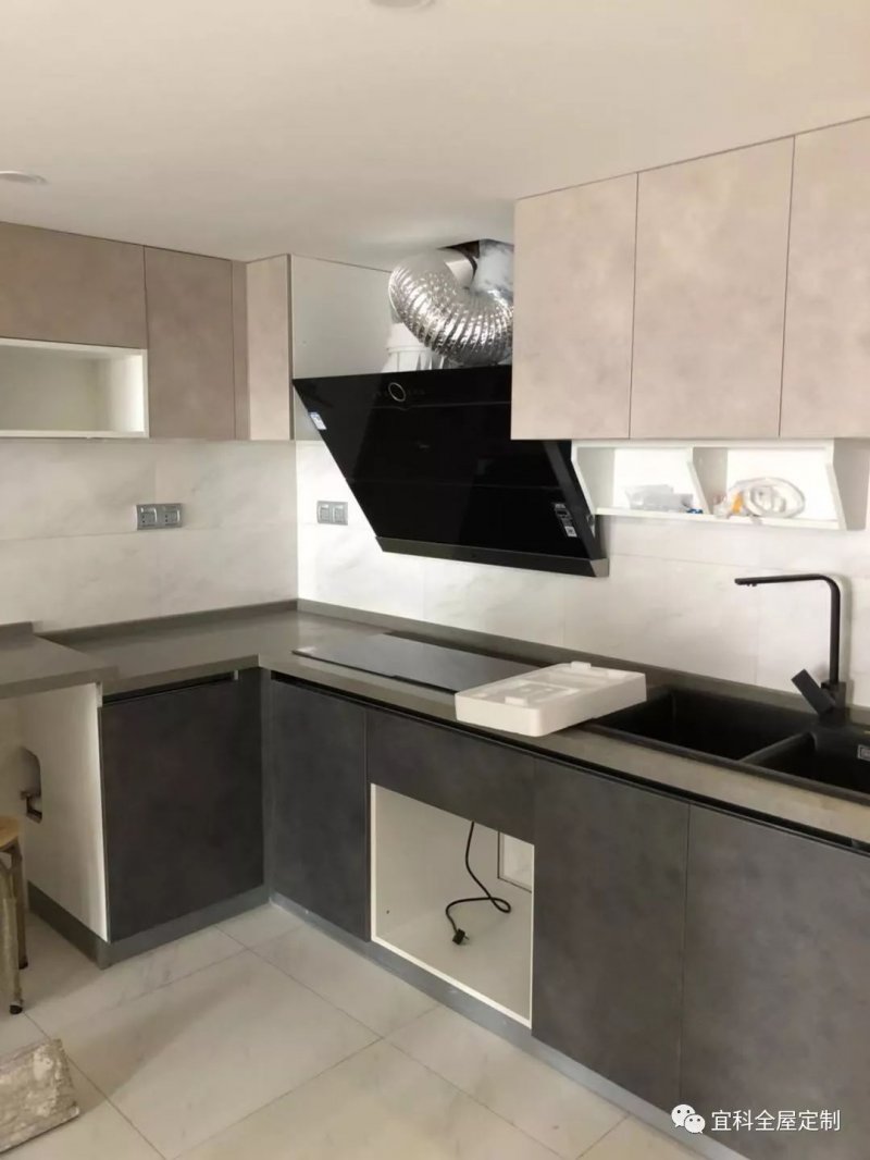 在裝修廚房時,多數(shù)人為了使廚房看起來干凈整潔,通常會選擇用白色來布置,但廚房畢竟是久經(jīng)油煙熏染重地,時間久了白色的家具容易泛黃,并且沾染油污后也不易于清理,影響美觀。因此這位客戶家的廚柜選用了符合整屋風格的深灰石紋系列,搭配現(xiàn)代化的廚房電器,令整個廚房科技感十足!