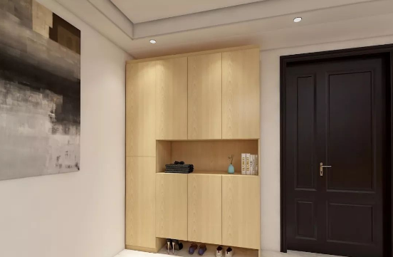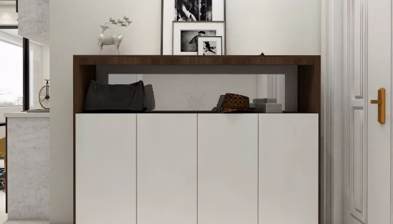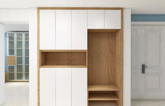 半開放的鞋柜隔斷是指上半部分呈開放式下半部分呈封閉式,或者左半部分為開放式,右半部分為封閉式等造型。