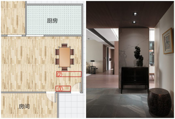 ▲玄關(guān)柜可直接靠墻-方案①,收納體積相對小,沒有遮擋視線作用;也可打造隔斷-方案②,收納空間可更大,也能遮擋視線,