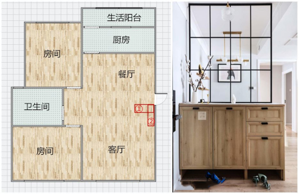 ▲這是非常常見的沒有玄關(guān)的兩室戶型,常見玄關(guān)解決方案如圖所示,方案①如下圖。