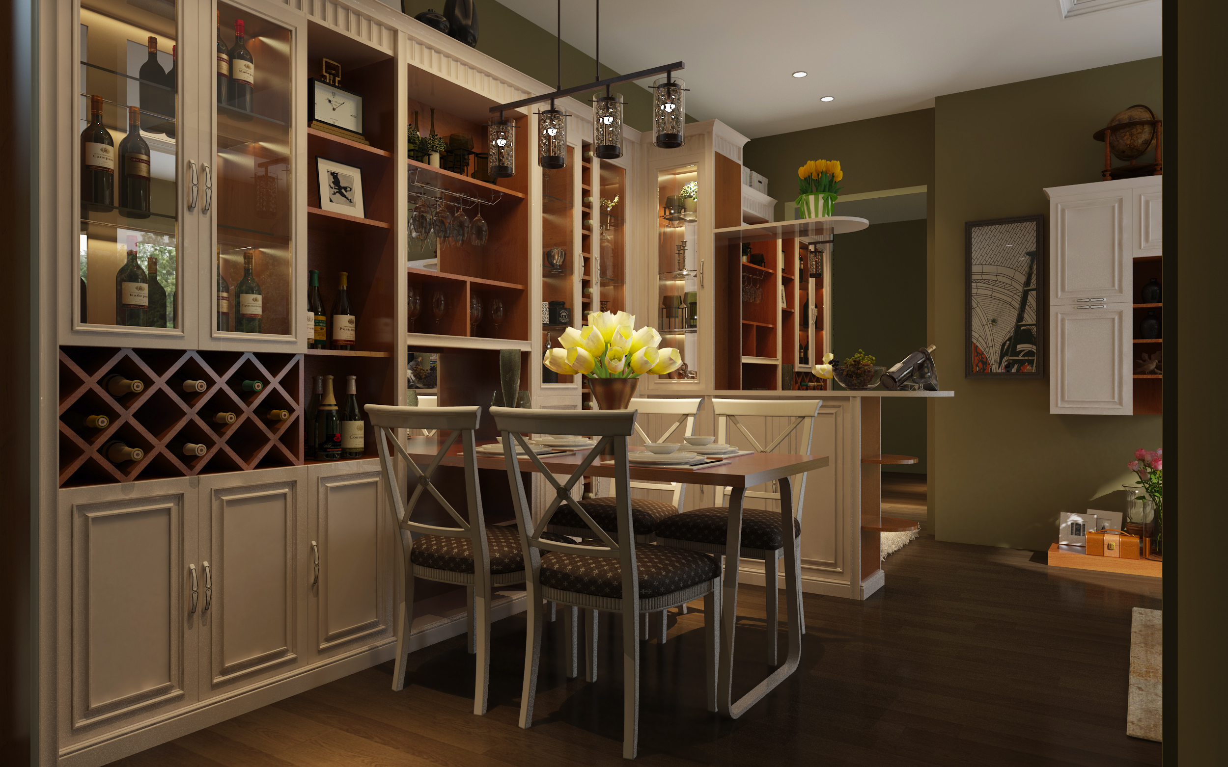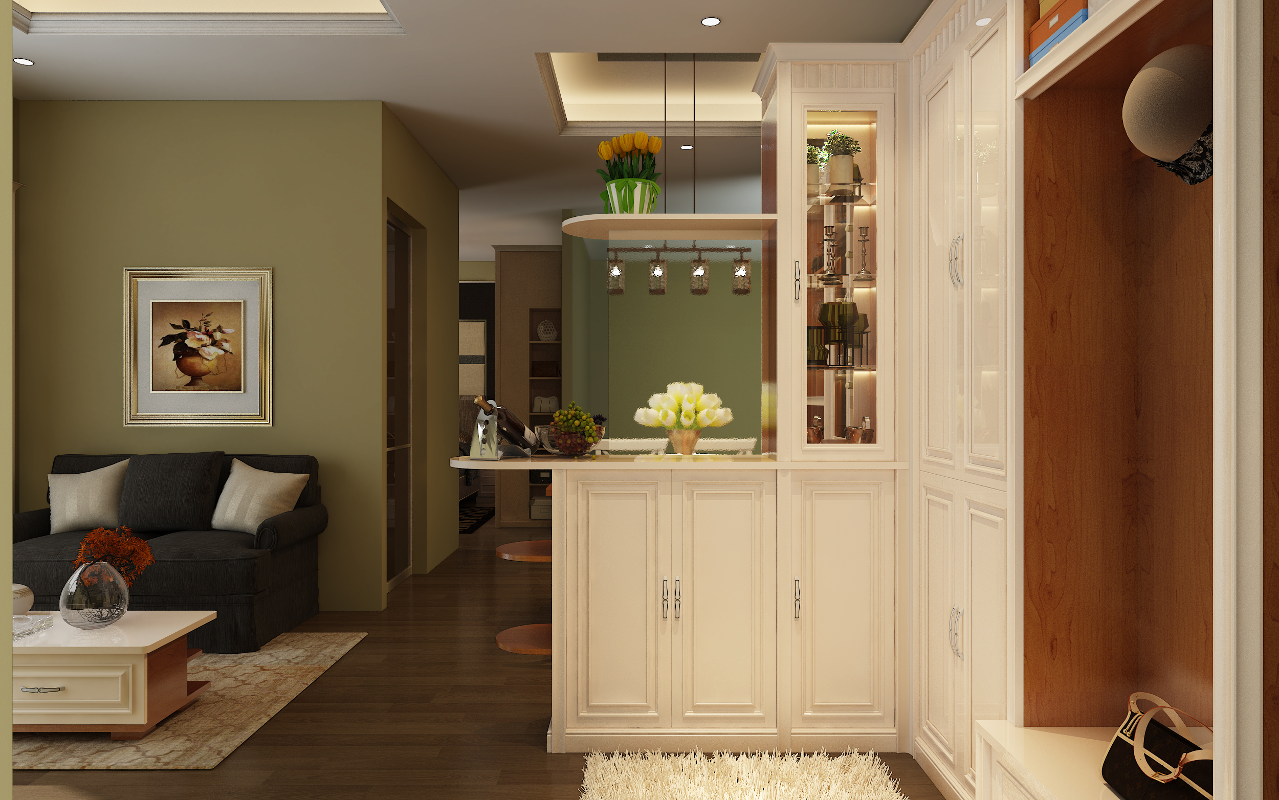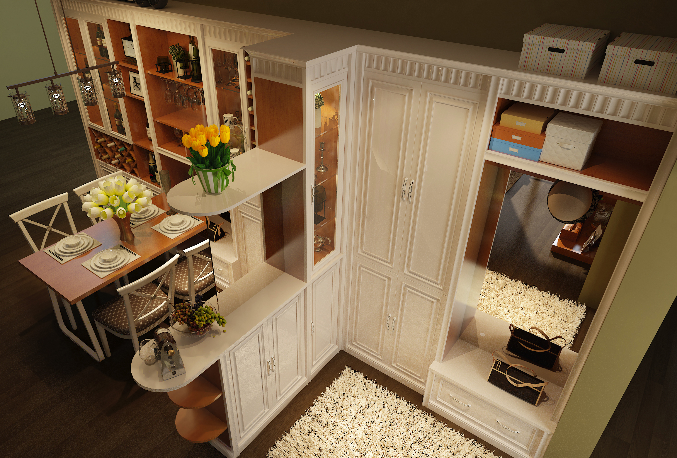 餐廳、玄關(guān)是一體式的定制家具全套打造,兩區(qū)之間,添設(shè)一組隔斷吧臺(tái),劃分空間的同時(shí)又能滿足儲(chǔ)物功能。