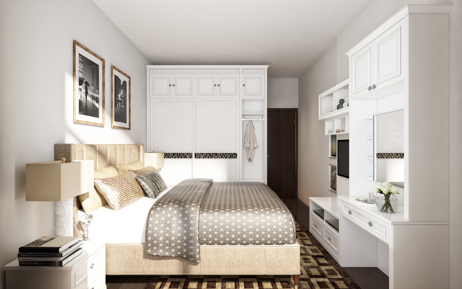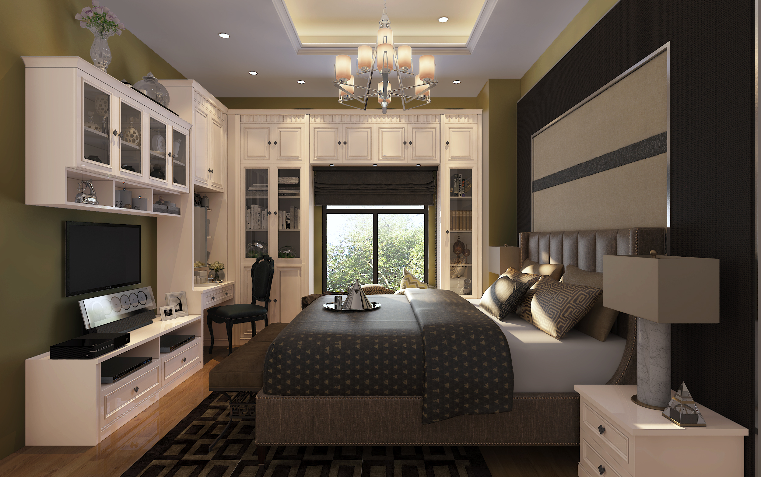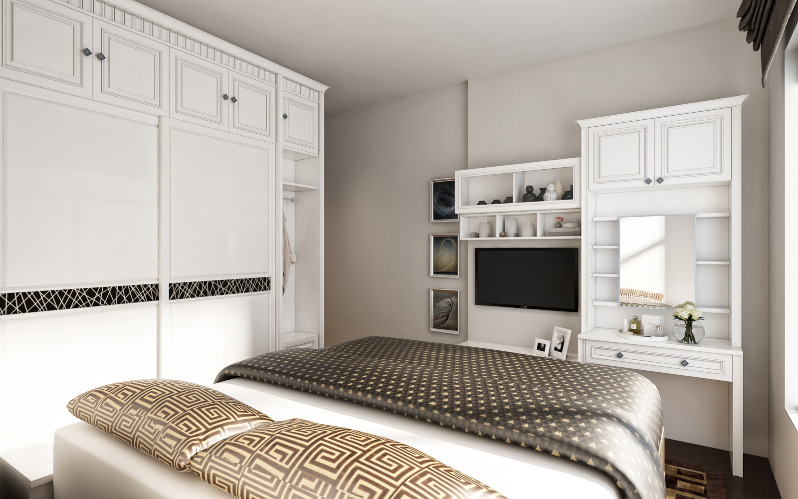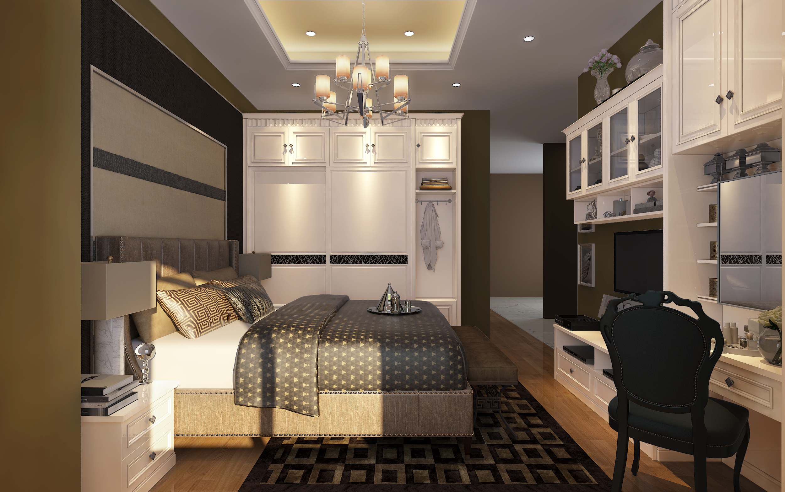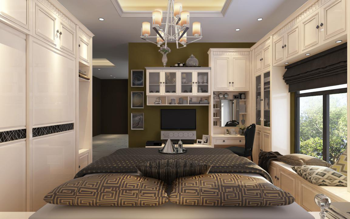 主臥定制空間,由陽(yáng)臺(tái)區(qū)、梳妝區(qū)、電視區(qū)共同打造,利用定制家具的多功能性,最大化利用每一寸空間,增強(qiáng)收納力,又能夠和整個(gè)家居風(fēng)格協(xié)調(diào)統(tǒng)一。