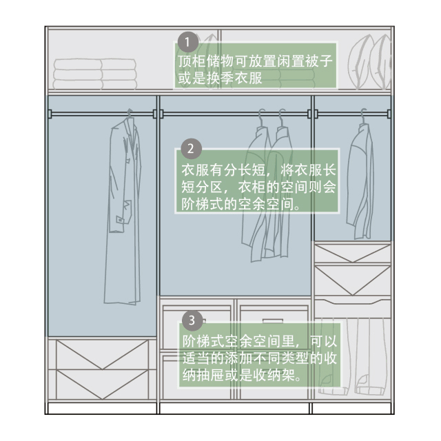 上層區(qū):因為其高度不方便拿取,使用率低,可以將被子、過季衣物儲物盒(儲物袋)中疊放或者并列放在上面。