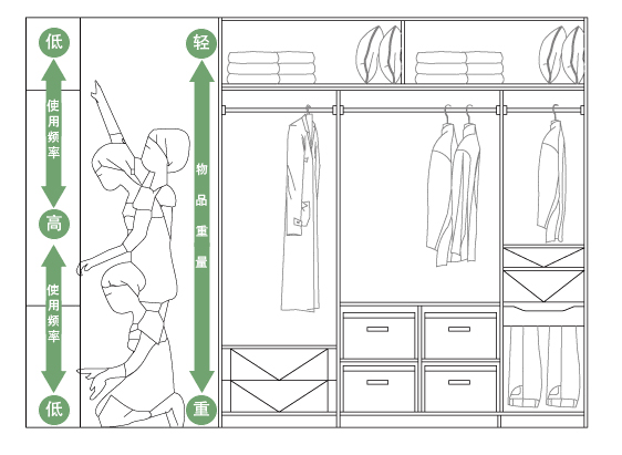 由下圖可以分析出我們設(shè)計衣柜時必須考慮的三點,第一點使用的頻率、第二點收納物品的重量、第三點人體工程學(xué),結(jié)合這三點的我們可以將衣柜分為三個不同的區(qū)域。