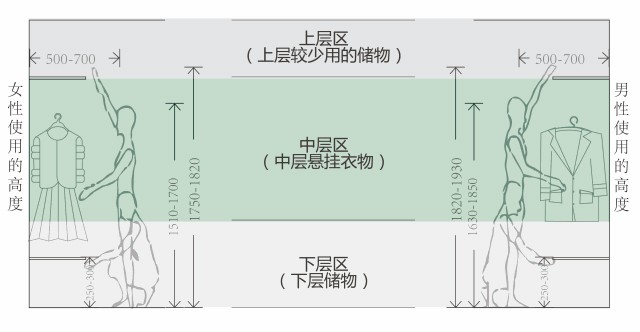 中層區(qū):中層區(qū)是存取物品最為方便的高度,這一層可放置掛一桿,根據(jù)衣服的長度再繼續(xù)長短分區(qū)。