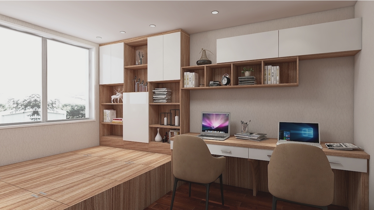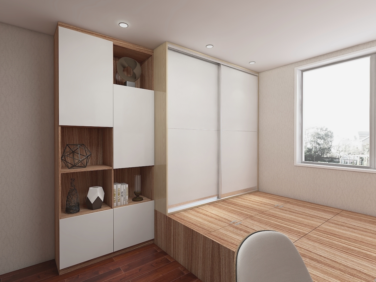 次臥榻榻米,依窗而立,以半遮掩的展示柜做頭,免拉手移門衣柜作尾,均以迪薩原木為主,琺瑯白作輔,自然又清新,簡潔不失大氣。