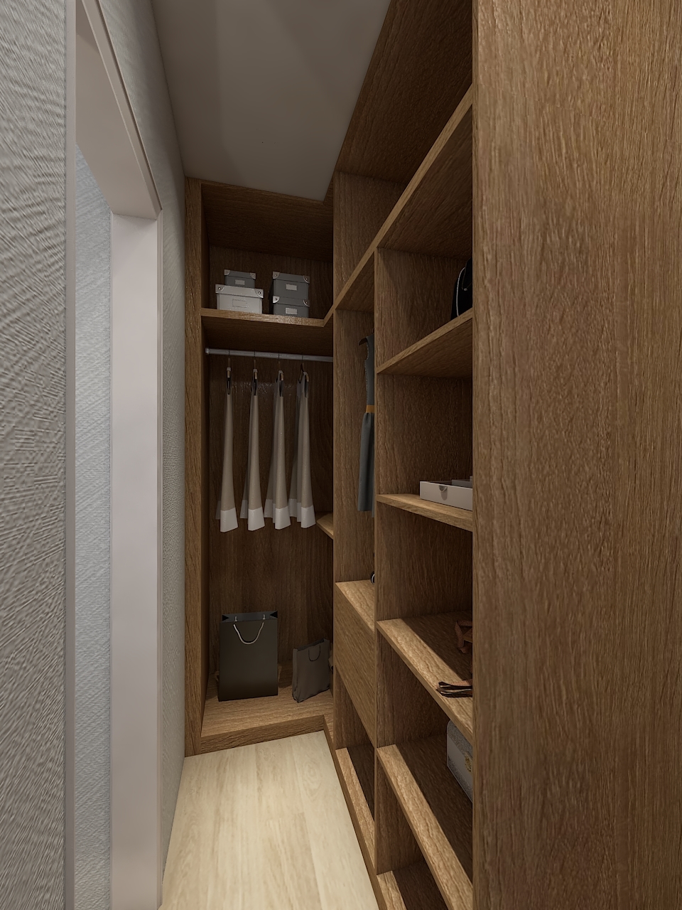 不大的衣帽間,僅容一人站立,科學(xué)合理的設(shè)計(jì),也使得換衣動(dòng)作得以有條不紊的進(jìn)行。