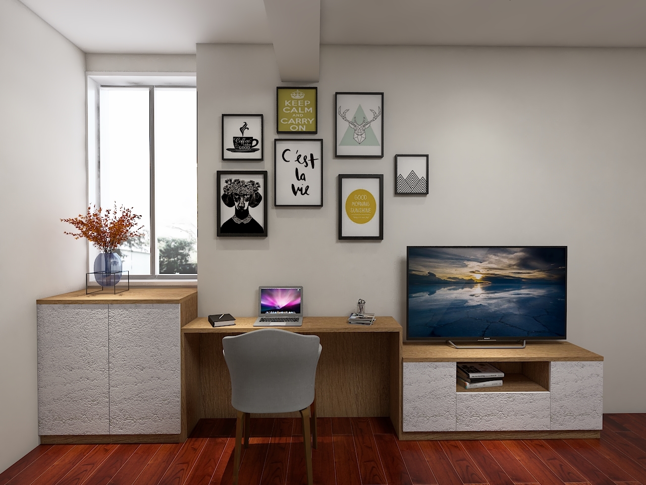 書房對(duì)立面,設(shè)立一組矮柜,將電視區(qū)域簡單劃出,錯(cuò)落有致的柜體設(shè)計(jì),豐富了空間層次,配以簡單的藝術(shù)掛畫,營造出一種溫馨文藝的居家感。