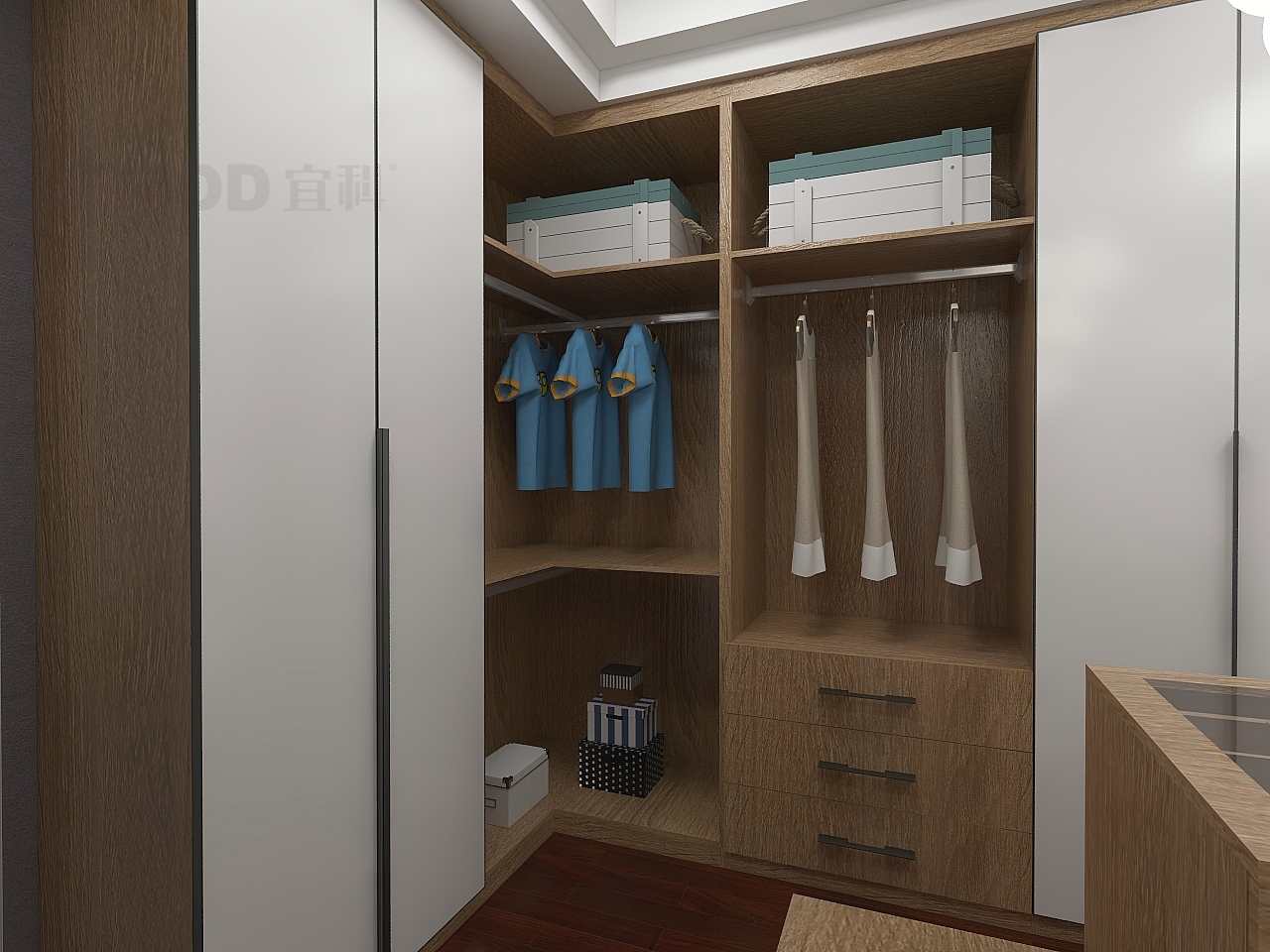 尾部衣柜旁,一組簡單的展示收納柜,呼應(yīng)了頭部書桌,結(jié)構(gòu)連貫的設(shè)計(jì),體現(xiàn)了空間美感。