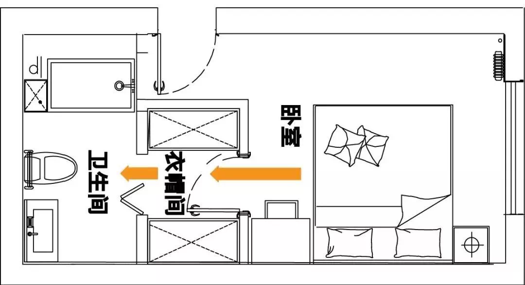丨利用過道空間丨針對一些主臥,在通往主衛(wèi)時(shí)會(huì)經(jīng)過一段過道空間,好好利用這段空間,隔離出一個(gè)穿過式衣帽間。拿衣服,洗澡,換衣服,出來,動(dòng)線合理。