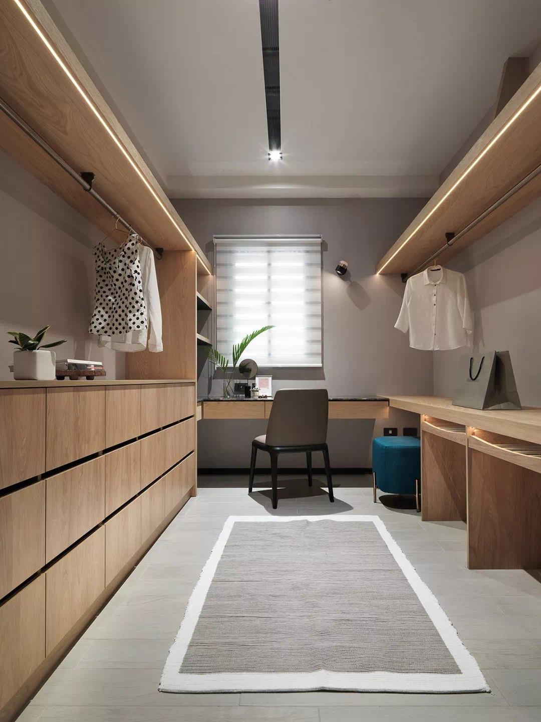 丨利用閑置空間丨另一種常見的辦法是,將閑置空間改成衣帽間,或者是衣帽間與其他功能區(qū)的合并。比如走廊、閑置的書房等。