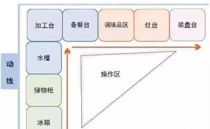 取材清洗處理食材烹飪裝盤,這里的動線設(shè)計要考慮到如何操作方便、節(jié)約時間。