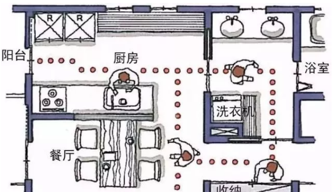 ● 活動比較頻繁的的區(qū)域應(yīng)當(dāng)盡量集中在一起,比如做飯一整套的活動(家務(wù)動線):