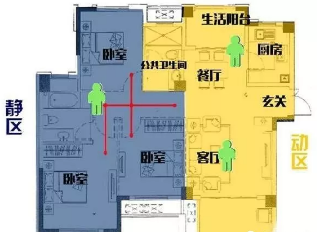 動區(qū)和靜區(qū)應(yīng)該分割明確,盡量避免動線交叉。這樣客人在聊天吃飯、找衛(wèi)生間時,就不會誤入臥室這樣的隱私區(qū)域。