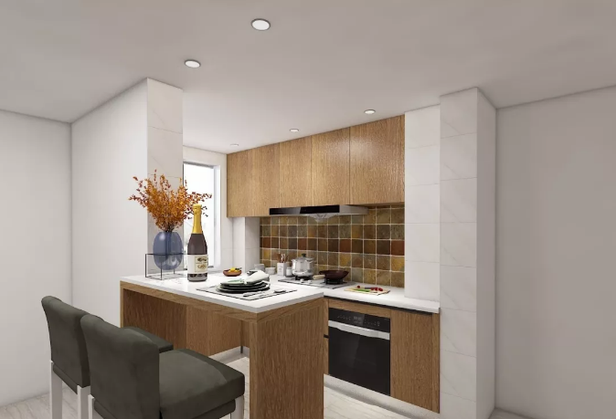 如果廚房受房型所限,不能安排得下獨立島臺,則可以倚靠一面墻或櫥柜、也可與餐桌連接,形成一個半島臺,可提升廚房的使用功能。最大程度地利用空間,是一種適合中型廚房的高效布局方式。
