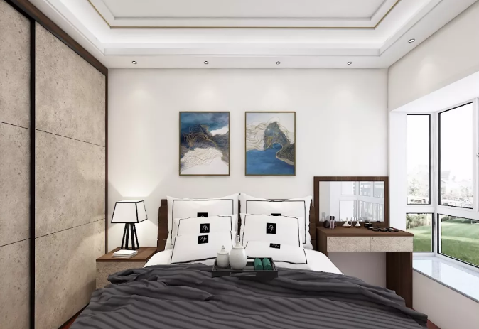 飄窗延伸頂柜設(shè)計(jì),設(shè)計(jì)成回字型,全方位收納。飄窗同樣做成“回”字型結(jié)構(gòu),上下左右的空間都得到充分的利用。側(cè)柜延伸出書桌和梳妝區(qū),打造了多功能區(qū),集收納、休閑和學(xué)習(xí)于一體。