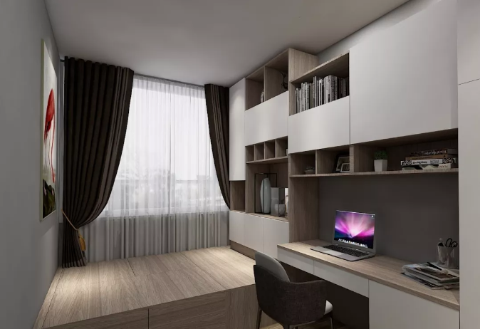 電腦桌與飄窗連接設(shè)計(jì),使得小空間下的電腦桌可利用空間增大,電腦桌椅可放在飄窗下方,在飄窗上面做格子支撐,整個(gè)桌面可以根據(jù)戶型的情況來選擇,并且其他多出格子可以收納其他的物品。