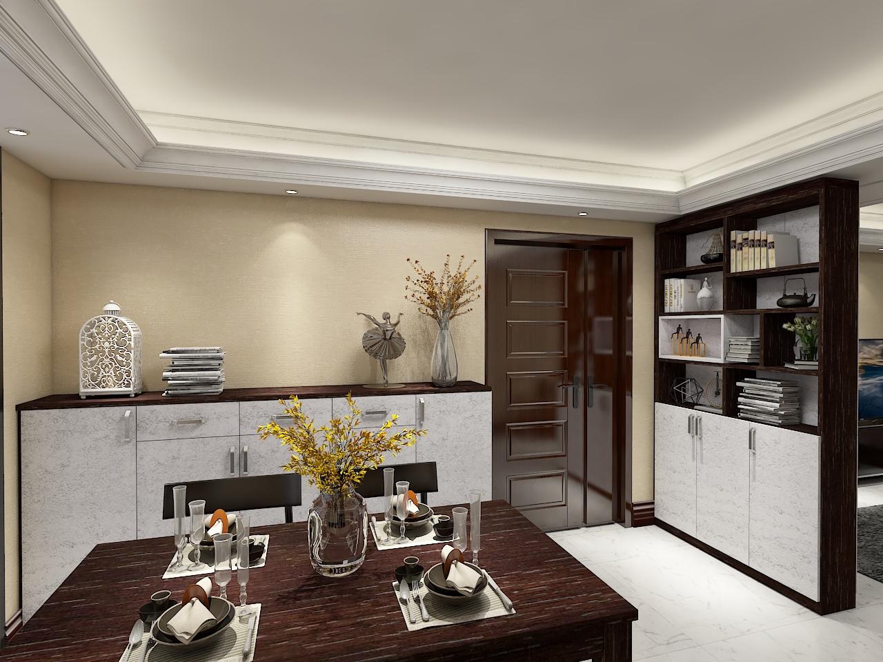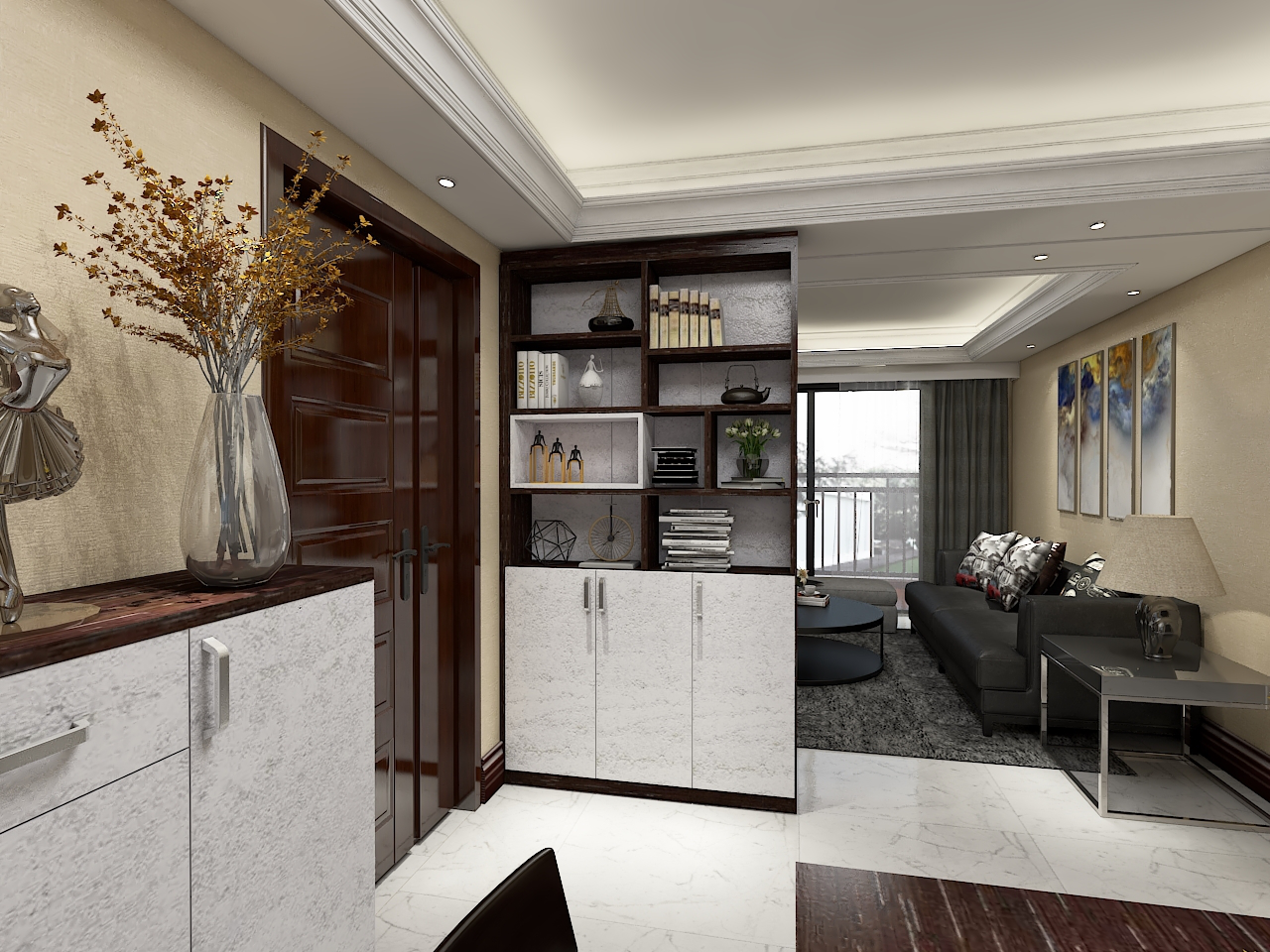 玄關(guān)隔斷博古架,在保護(hù)私密的同時(shí),實(shí)現(xiàn)了功能分區(qū),上為藝術(shù)展示區(qū),下為實(shí)用收納區(qū),使來源于生活的藝術(shù),回歸生活。