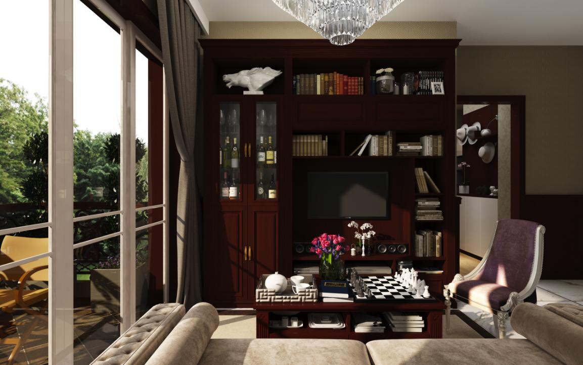 以酒會友、博古論今,書房式客廳怎少的了酒香與墨香。電視區(qū)主宰著客廳的顏值,而電視背景墻是整個(gè)客廳的視覺中心,以酒柜+書柜構(gòu)成的電視墻,兼顧書墨的芬芳與酒香的清冽。