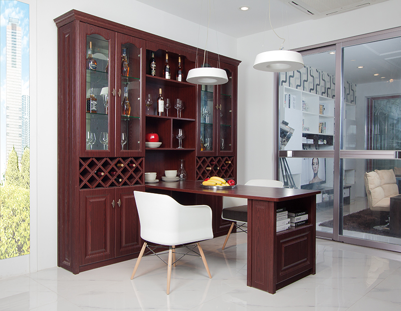 餐廳式酒柜,集合了餐廳所需家具的所有特性。如圖所示,以酒柜功能為主,下部?jī)蓚?cè)柜體可收納平日所用餐具,餐桌從其內(nèi)部延伸而出。此情此景,好友小聚,把酒言歡;亦或是浪漫進(jìn)餐,靜享二人世界,平淡的生活也能有別樣的情調(diào)!