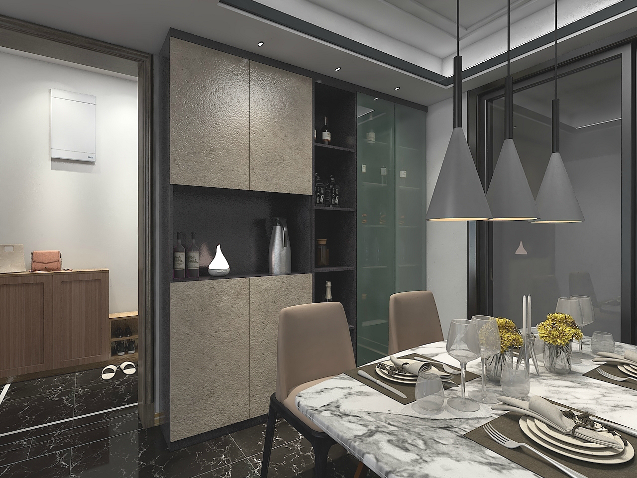 同一種載體,同時(shí)實(shí)現(xiàn)玄關(guān)、酒柜兩種功能,打造一款玄關(guān)式酒柜就能滿足。以矮柜的方式拼接出玄關(guān)、用餐兩大功能集合體,以白石紋、薩那黑橡兩大元素為主導(dǎo),白石紋清冷雅致,薩那黑橡高貴神秘,二者通過氣質(zhì)間的相互渲染,共同提升空間格調(diào)。