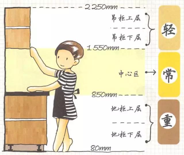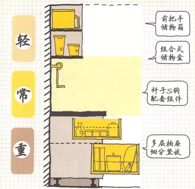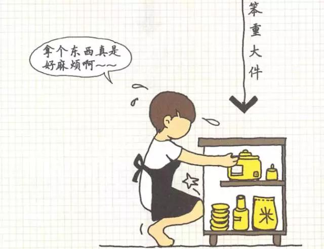 這里是寸土寸金,無論是廚具、電器還是調(diào)味品,如果不是每天,每噸頻繁使用的話,請(qǐng)不要占用這塊寶貴的區(qū)域;這個(gè)區(qū)域的關(guān)鍵詞是--常