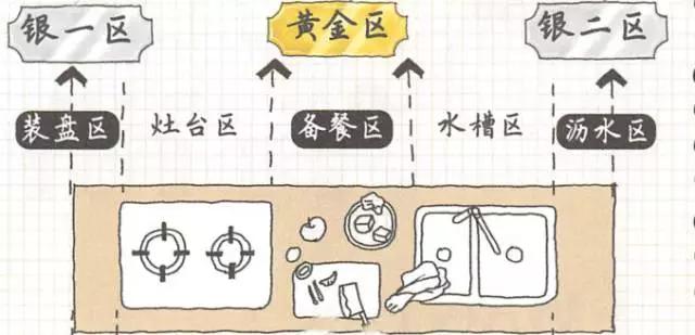 黃金區(qū)(備餐區(qū)):放砧板、菜刀,切菜的區(qū)域。活兒最多,東西也最多;所以至少要600mm,最好是達(dá)到800mm;