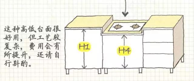 H4:灶臺(tái)的高度,一般來講與操作臺(tái)的高度一致,對(duì)于西餐的平底鍋是沒有壓力的,但是對(duì)于中式炒鍋,鍋的高度有50mm,而且高檔的炒鍋越來越重,這樣就非常考驗(yàn)矮個(gè)子的腕力,所以建議下降80mm。