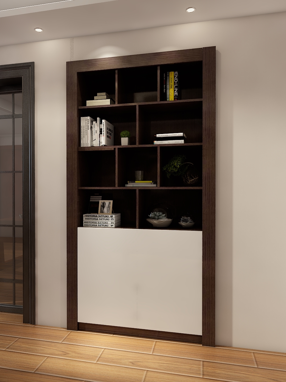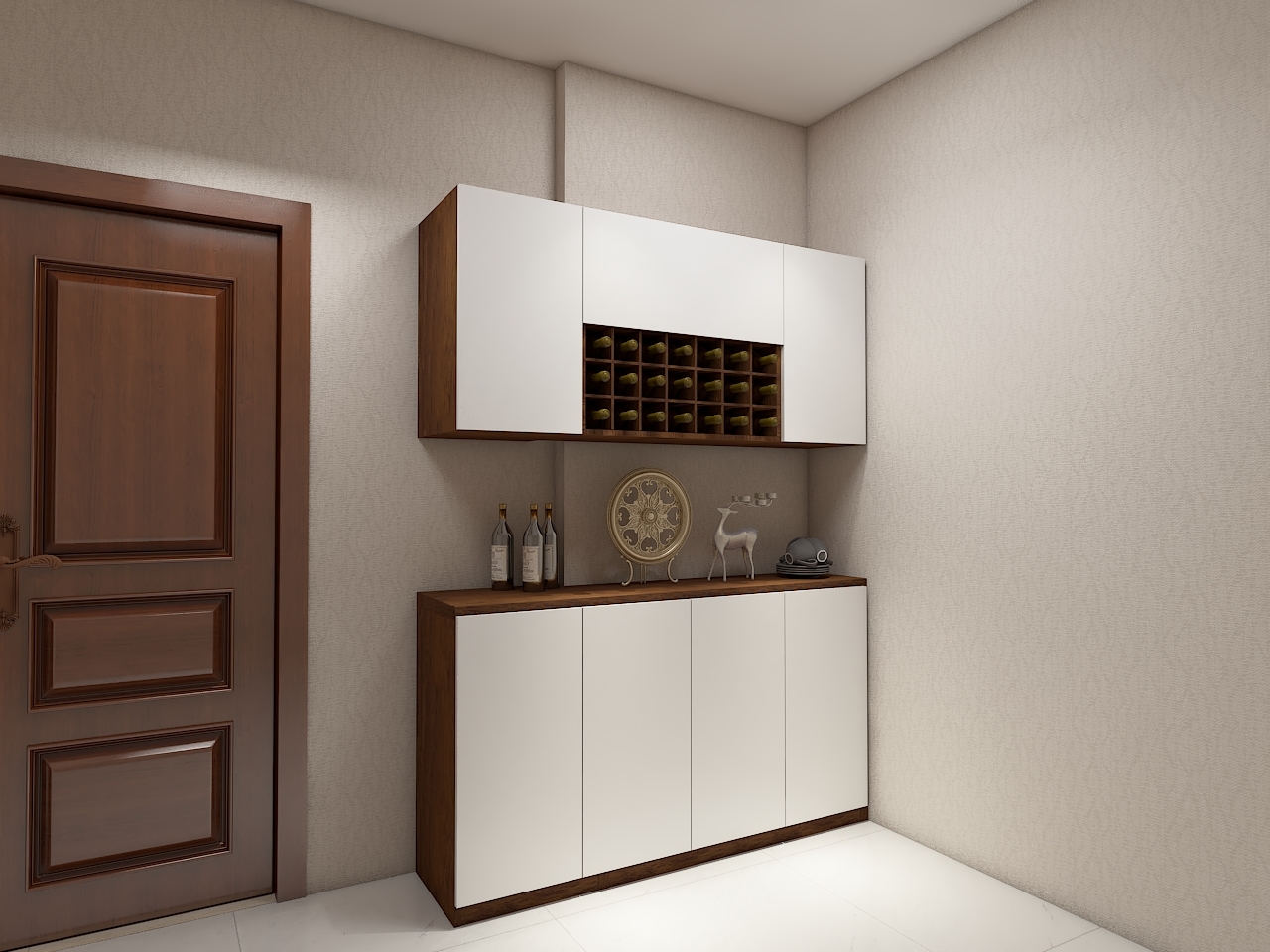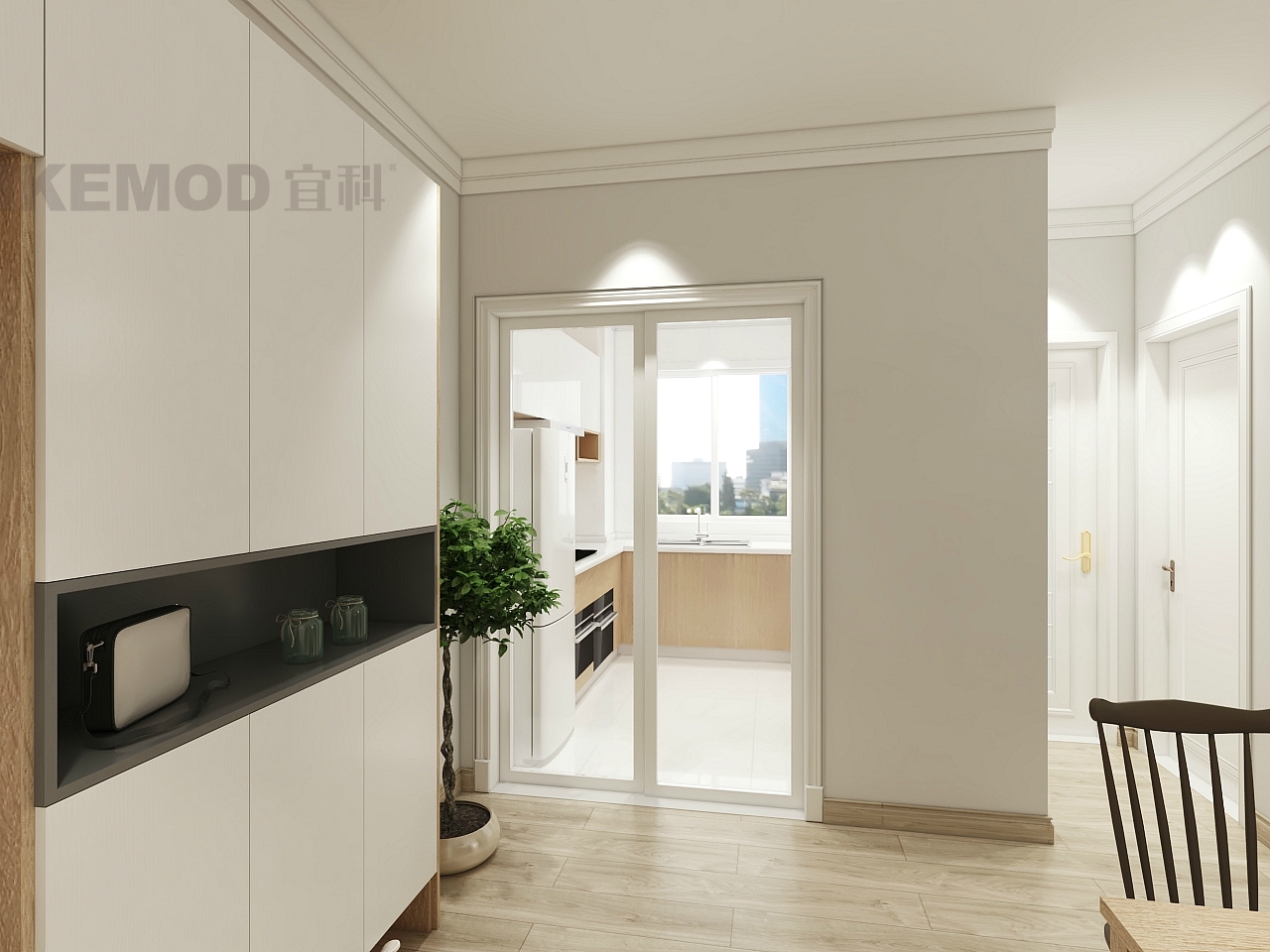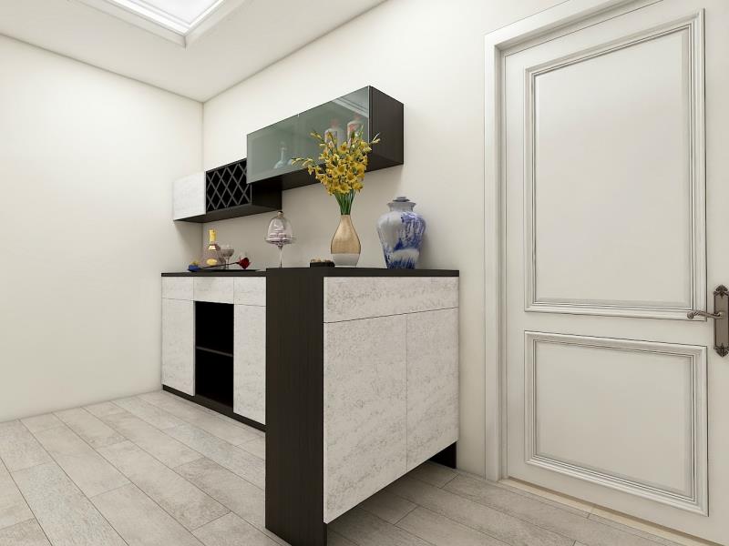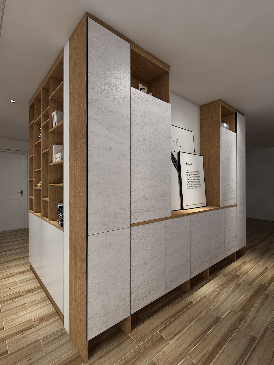 墻體兩側(cè)功能性家居實(shí)物,均以迪薩原木做框架,大氣的到頂式設(shè)計(jì),打造出不一樣的視覺體驗(yàn)。玄關(guān)以鏤空展示架+收納鞋柜上下式結(jié)構(gòu)打造,鞋柜下部,以60公分內(nèi)凹式踢腳板做打底,光滑的高光白柜體,便于日常清潔維護(hù);餐邊柜布局設(shè)計(jì),使區(qū)域空間融入對(duì)稱之美。