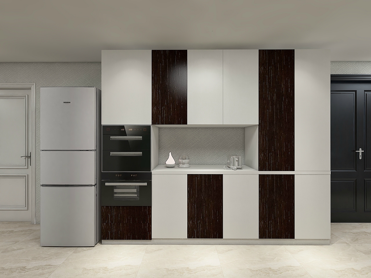 拼接柜體的L型設(shè)計(jì),以內(nèi)外結(jié)構(gòu)劃分功能區(qū)域。進(jìn)門外側(cè)為玄關(guān)矮柜,方便進(jìn)門換鞋的第一動(dòng)作,內(nèi)為餐邊柜,上方墻體,兩組吊柜錯(cuò)落排開,彌補(bǔ)了空白墻面的單調(diào)。這種針對(duì)小戶型設(shè)計(jì)的多功能組合柜,有效解決了空間不足的問題。