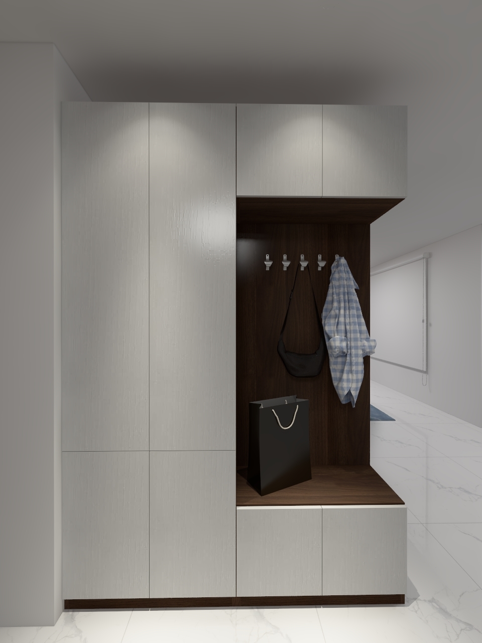 整體式玄關(guān)柜,以傳統(tǒng)衣柜打底,在其基礎(chǔ)上做略微改動(dòng)。上圖玄關(guān)柜,采用貼頂式設(shè)計(jì),擴(kuò)容收納,以兩側(cè)封板為支撐,抬高柜體,使底部懸空,保持房間的整潔不會(huì)被凌亂的鞋子破壞。局部柜面,以玻璃增加透光度。