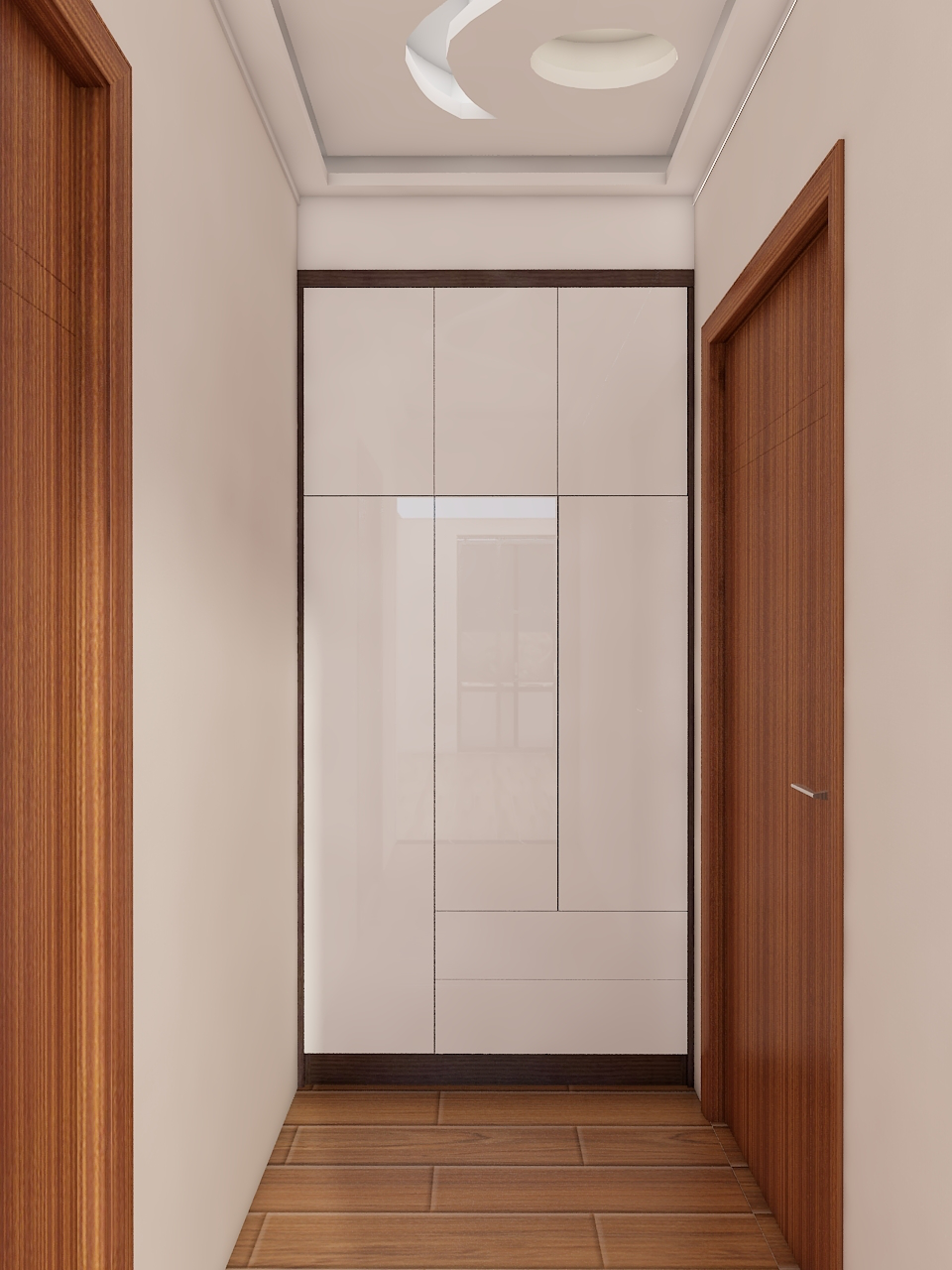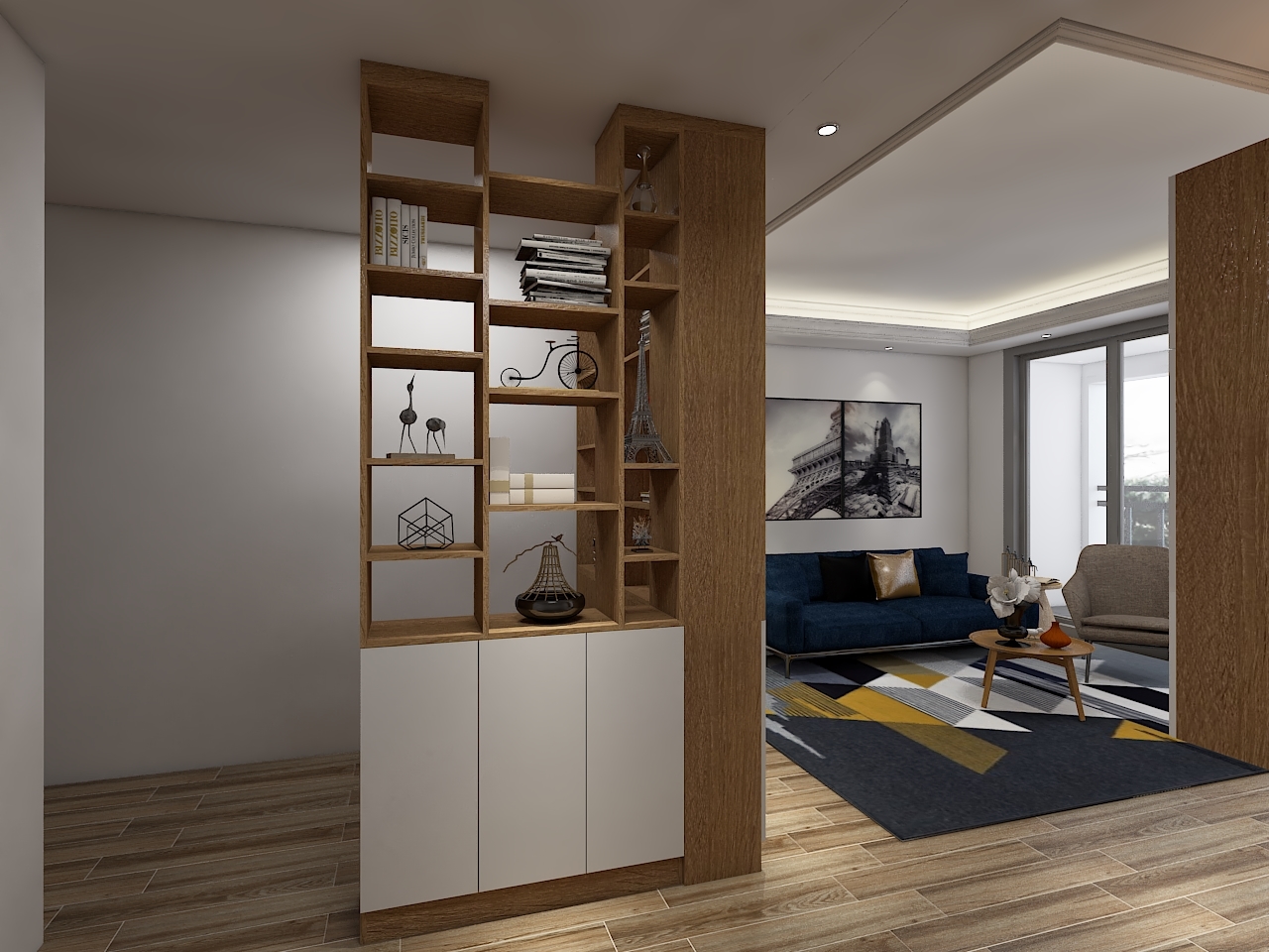主、次臥間以通道相隔,進(jìn)門正對(duì)通道盡頭,這類戶型布局在普通老百姓家中也較為常見。以本案為例,業(yè)主為了保持開放式客廳的風(fēng)格一致,將玄關(guān)柜設(shè)立在通道盡頭,為了不破壞回字頂?shù)目臻g美感,以不到頂?shù)睦砟钤O(shè)計(jì)柜體。