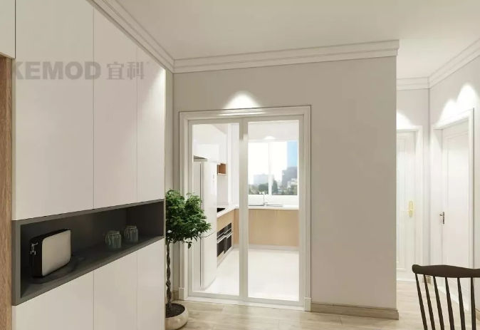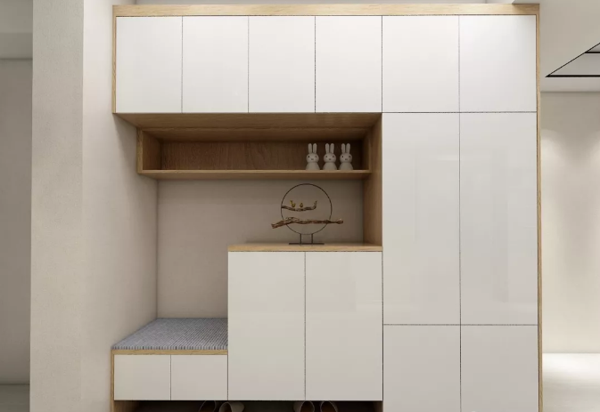 整體式玄關(guān)柜,以傳統(tǒng)衣柜打底,在其基礎(chǔ)上做略微改動。上圖玄關(guān)柜,采用貼頂式設(shè)計,擴容收納,以兩側(cè)封板為支撐,抬高柜體,使底部懸空,確保房間的整潔度不會被凌亂的鞋子破壞。局部柜面,以玻璃增加透光度。