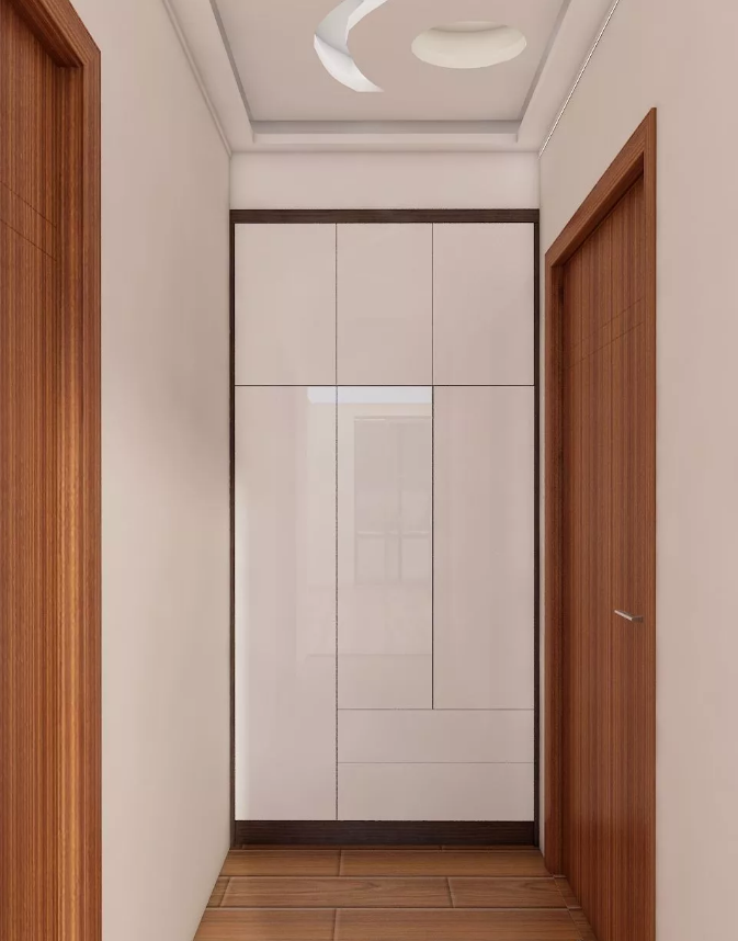 主、次臥間以通道相隔,進門正對通道盡頭,這類戶型布局在普通老百姓家中也較為常見。以本案為例,業(yè)主為了保持開放式客廳的風(fēng)格一致,將玄關(guān)柜設(shè)立在通道盡頭,為不破壞回字頂?shù)囊曈X美感,以不到頂?shù)氖址ㄔO(shè)計柜體。