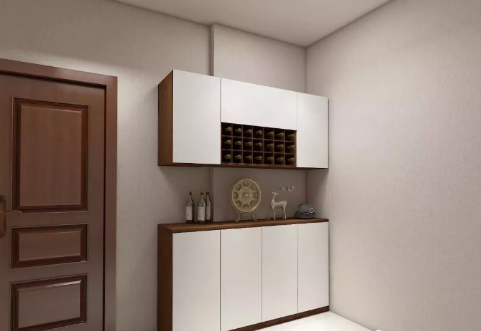 平行式玄關(guān)柜,上為吊柜,下是地柜,兩組柜體中部懸空、平行排列,也是比較常見的大眾玄關(guān)設(shè)計之一。而這位客戶則將上吊柜部分區(qū)域改為儲酒區(qū),以菱形柵格式對外開放,為角落風(fēng)景增色不少。
