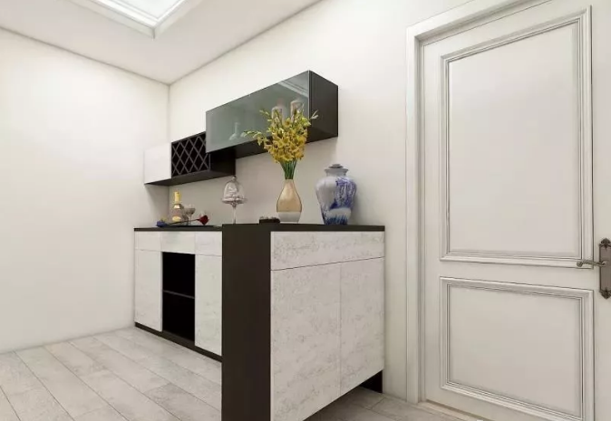 適用于大戶型的L型玄關(guān)設(shè)計,用入戶玄關(guān)與餐邊柜的家具實物,將兩側(cè)墻體立體連接,在同一區(qū)域,同時實現(xiàn)兩種功能。