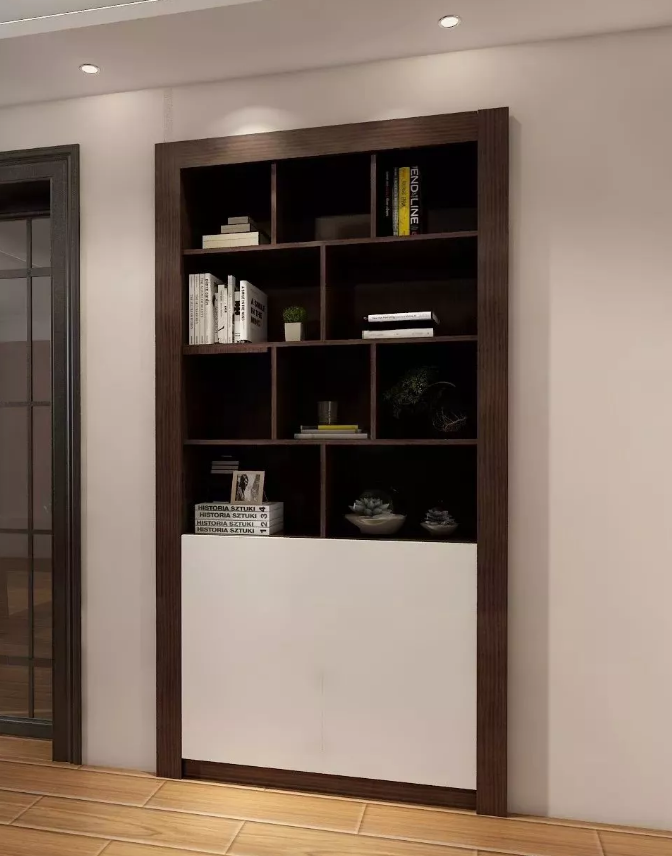 以四周封板為框架,上下各用吊柜鑲嵌,中部以框型結(jié)構(gòu)做填充,來劃分收納展示區(qū)域。用灰色作跳色,增加質(zhì)感。這種為了保持柜體連貫性的完整性設(shè)計,迎合了多數(shù)客戶以實用為主、兼顧顏值的消費理念。