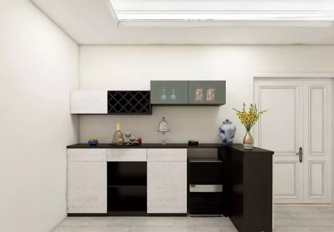 墻體兩側(cè)功能性家居實物,均以迪薩原木做框架,大氣的到頂式設(shè)計,打造出不一樣的視覺體驗。玄關(guān)以鏤空展示架+收納鞋柜上下式結(jié)構(gòu)打造,鞋柜下部,以60公分內(nèi)凹式踢腳板做打底,光滑的高光白柜體,便于日常清潔維護;餐邊柜布局設(shè)計,使區(qū)域空間融入對稱之美。