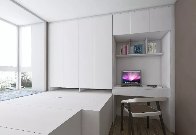 其實,臥室可以省略一個床頭柜。在床頭位置設計一款小書桌,既能辦公,還可以當梳妝臺使用。450mm以上的進深,就能將手臂放到桌面來操作電腦,桌下放腿的空間也足夠寬敞