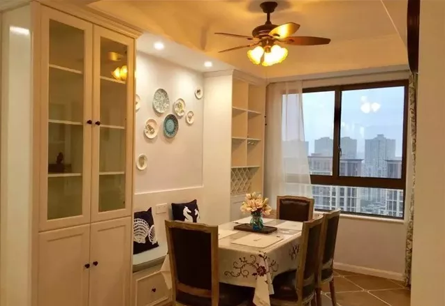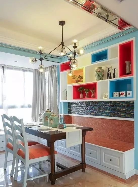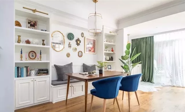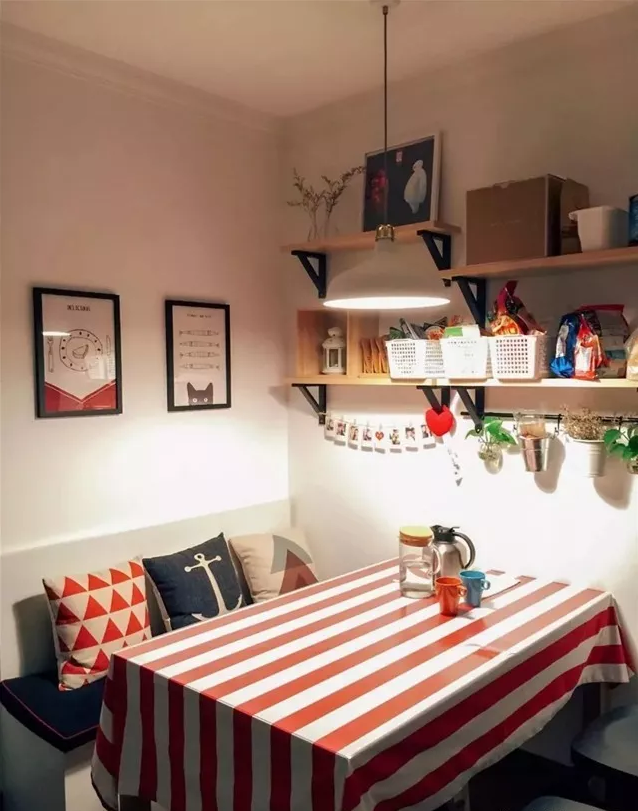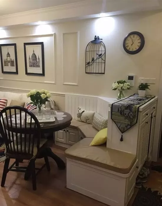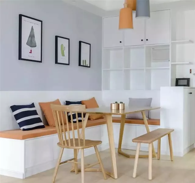 利用閑置的墻面將它布置成卡座,既能有效的解決就餐問(wèn)題,又能為居室增加許多收納空間。