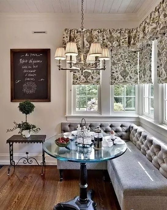一個(gè)簡(jiǎn)單的轉(zhuǎn)角卡座設(shè)計(jì),搭配一張實(shí)木餐桌,再裝點(diǎn)上鮮花吊燈,這里便成了一個(gè)溫馨的就餐空間。