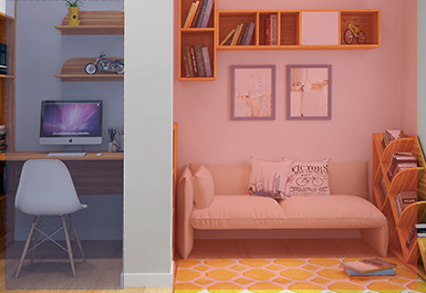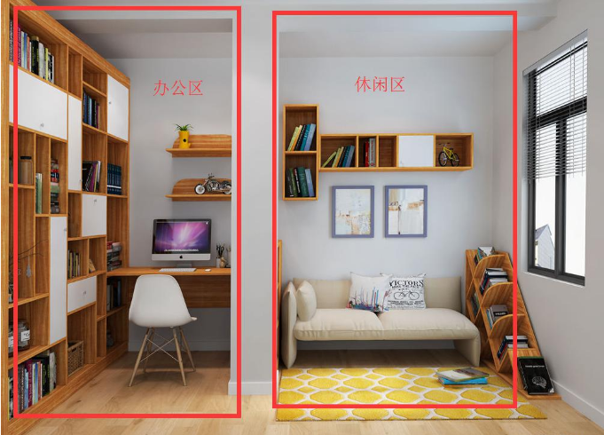 設(shè)計(jì)師建議:梁柱在書(shū)房中央,整個(gè)書(shū)房又想要設(shè)計(jì)成一個(gè)可辦公可以休息的空間,那么可以梁柱為軸設(shè)計(jì)隔斷柜,將整個(gè)空間一分為二,一邊作為辦公區(qū)域,一邊作為休息區(qū)域,讓家具與梁柱形成一個(gè)統(tǒng)一的整體。