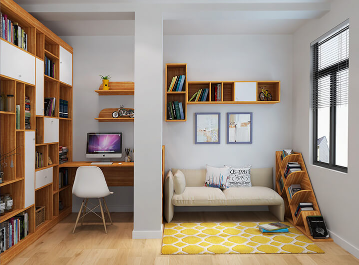 同時(shí)書(shū)柜采用開(kāi)放式與閉合式結(jié)合設(shè)計(jì),門(mén)板顏色與梁柱顏色一致,這樣即可淡化書(shū)房中央梁柱的存在感,又可以保持整個(gè)書(shū)房的美觀性,增加書(shū)房的功能,一舉兩得!