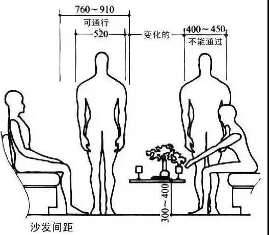 當(dāng)兩組沙發(fā)相對(duì)放置時(shí),尺寸的問(wèn)題要非常小心,不然到時(shí)候直接讓你懷疑人生。 當(dāng)沙發(fā)上坐人時(shí),其他人若能正常通行,那么茶幾與沙發(fā)較為適宜的距離為 760-910mm。