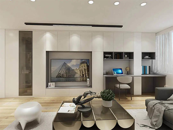電視柜和書桌的組合,造型靈活多變,巧妙地增加儲(chǔ)物空間與辦公區(qū)域。同時(shí)兼具實(shí)用性與現(xiàn)代感,讓空間看起來利落清爽。