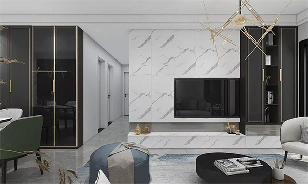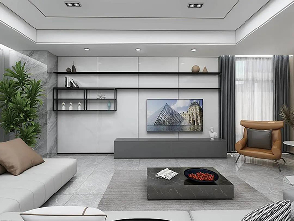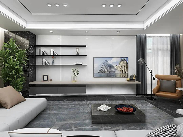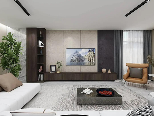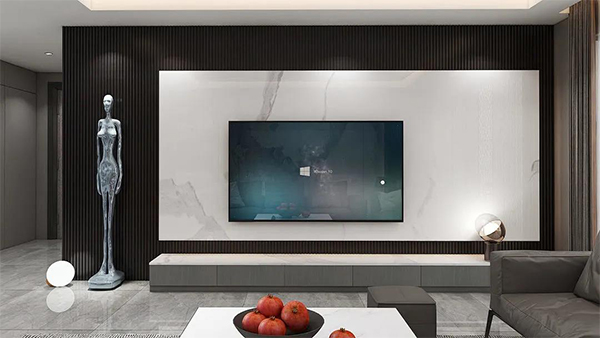 電視機(jī)采用壁掛設(shè)計(jì),背景則是格柵+巖板、前衛(wèi)時(shí)尚、具有強(qiáng)烈的質(zhì)感。